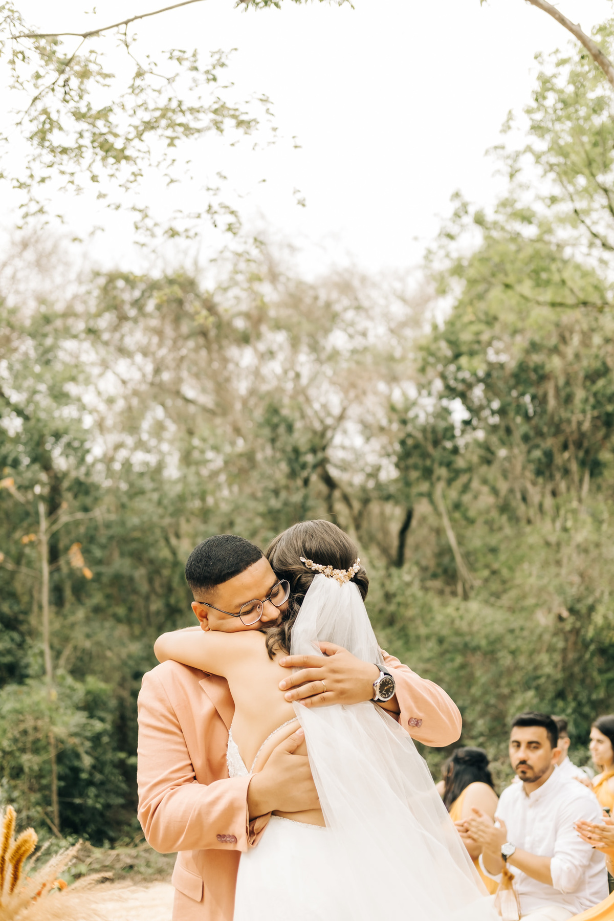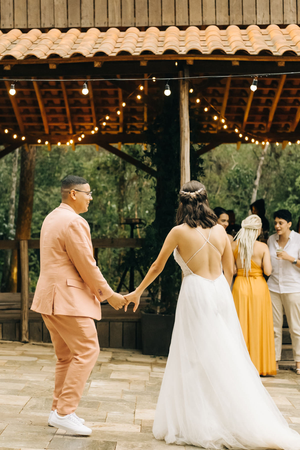 decoração de casamento boho bohemian Village Itu sp - ar livre - por do sol - Ava fotografia - terno rosa - salmão - salmon - saída dos noivos