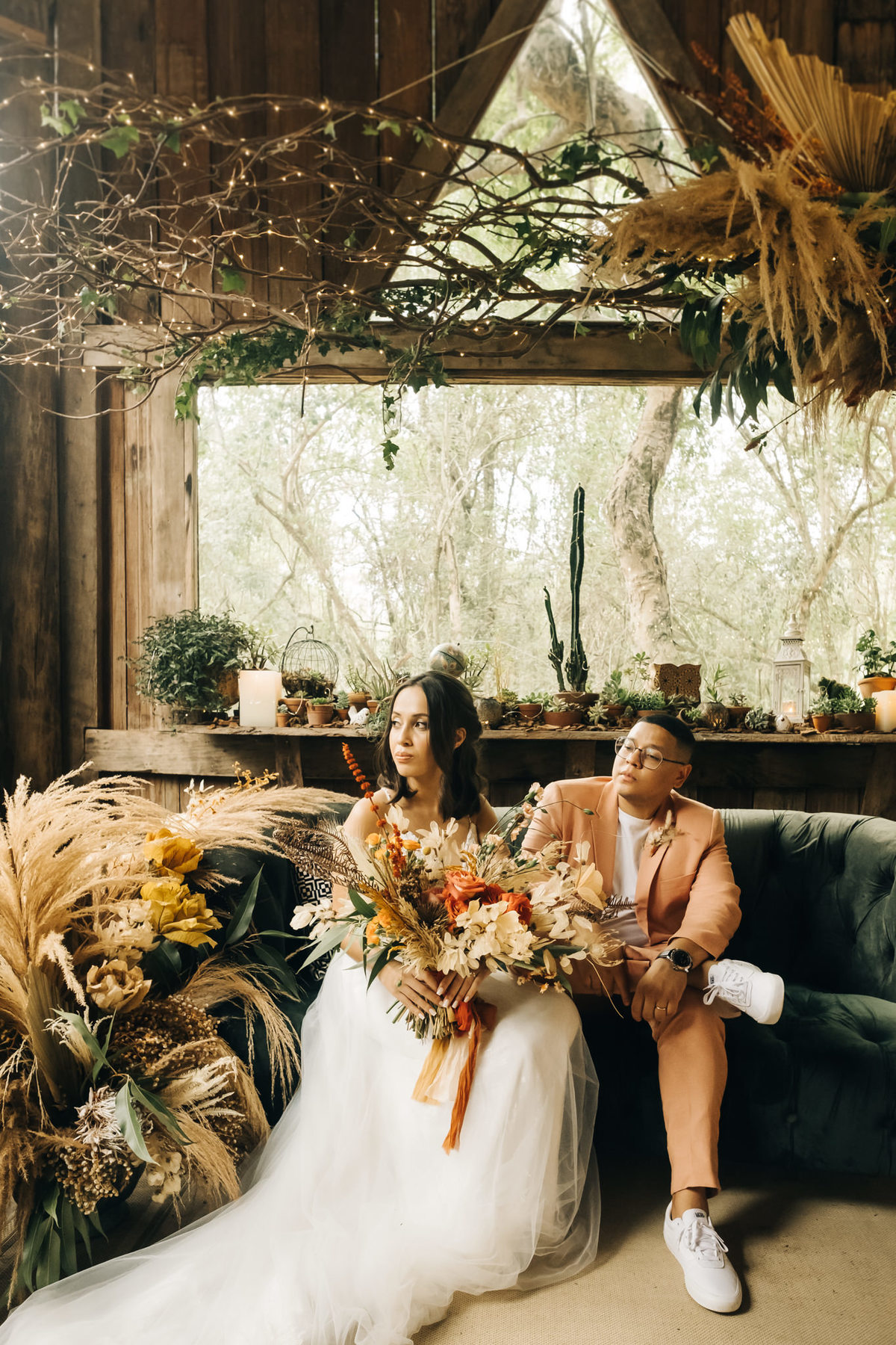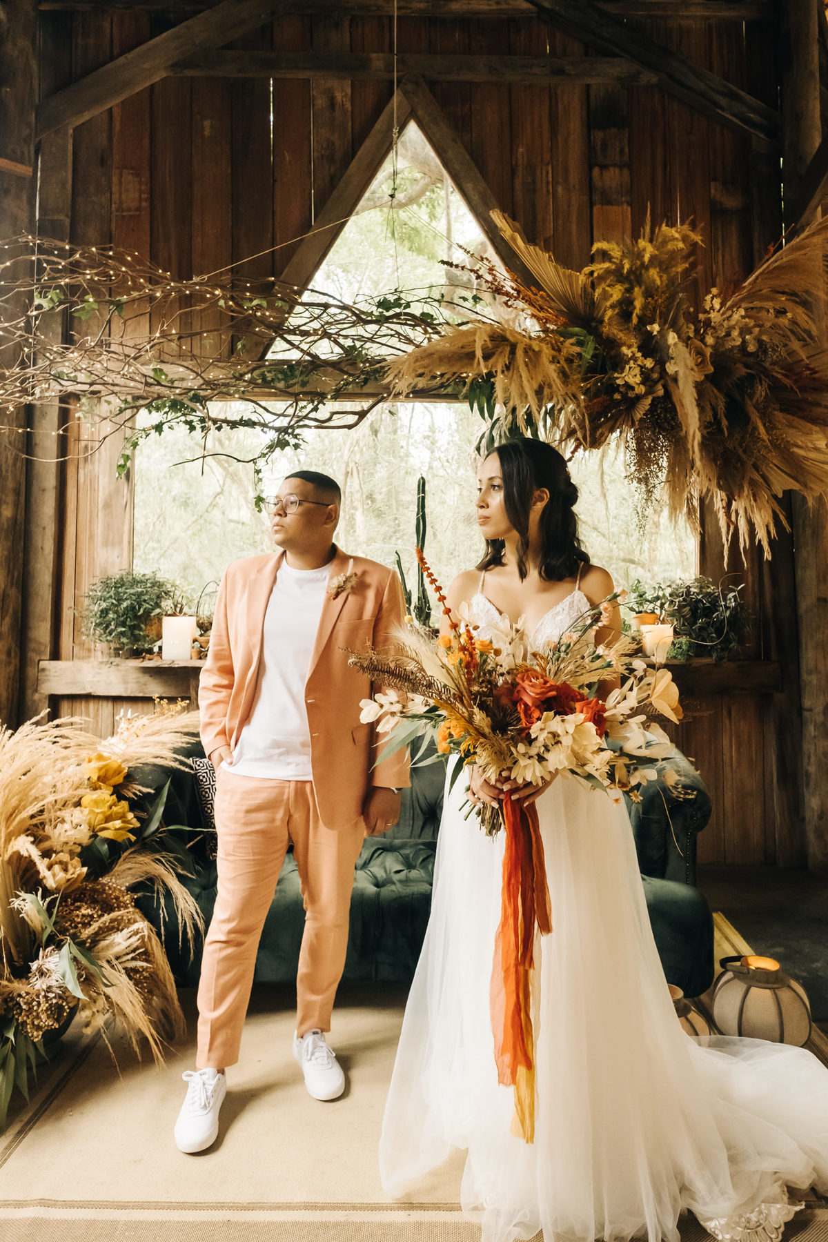 decoração de casamento boho bohemian Village Itu sp - ar livre - por do sol - Ava fotografia - terno rosa - salmão - salmon - ensaio de casal - celeiro